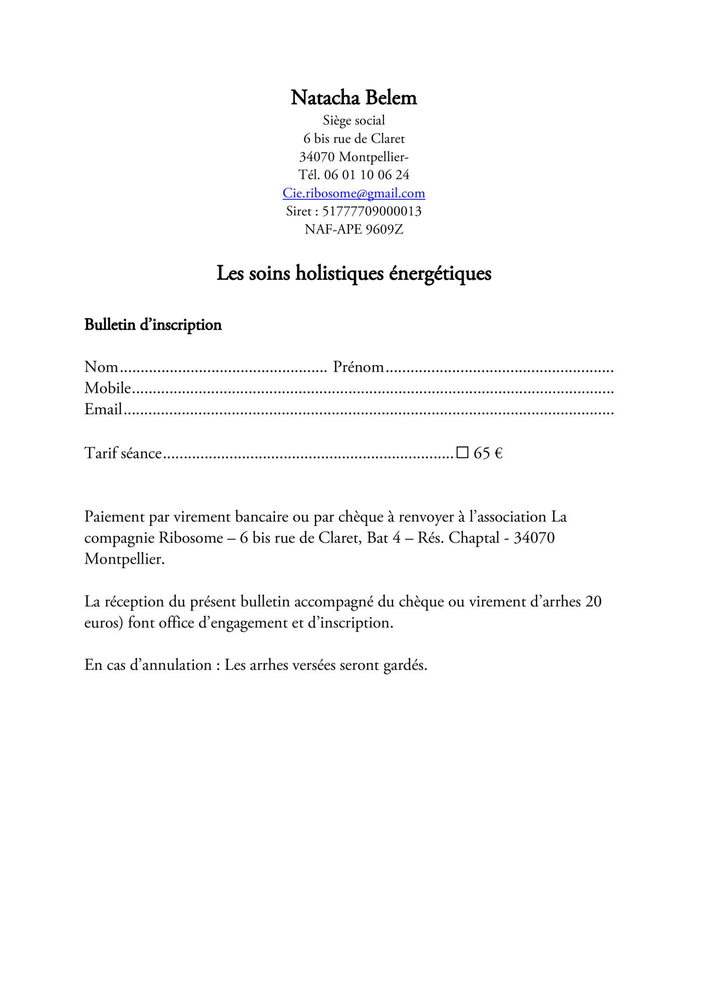 Natacha Belem est diplômée en soins et transferts énergétiques et pratique également en biodynamique le travail des facias ainsi que le magnétisme.